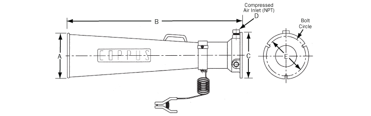 壓縮空氣或蒸氣透過(guò)單一入口接合裝置 進(jìn)入Jectair鼓風(fēng)機(jī)。由噴嘴噴出的氣體或蒸氣,形成文丘里原理,吸引周圍空氣經(jīng)由入口進(jìn)入Jectair,空氣便透過(guò)管狀擴(kuò)散管以高速率的方式被排放出來(lái)。